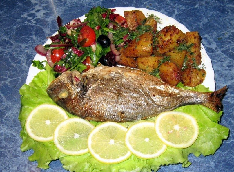 Для подачи к столу на плоскую тарелку выложить свежие листья салата. На них разместите дорадо, добавьте кружки лимона и гарнир.