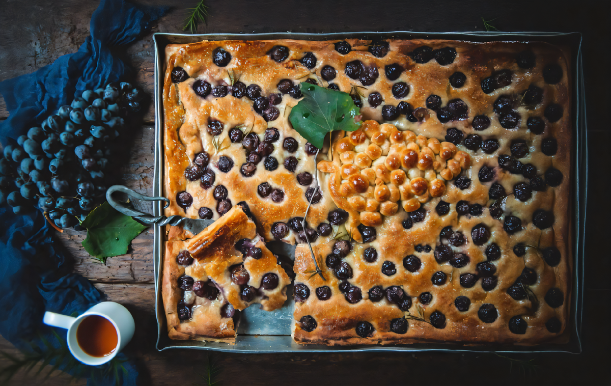 - Schiacciata all’uva — это оригинальная фокачча с виноградом, запечённая с сахаром и розмарином. Сладкие ягодки гармонично сочетаются с нежным тестом, создавая легчайший пирог.