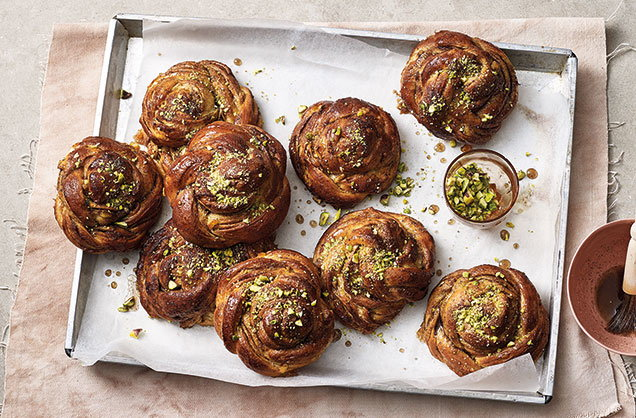 На следующем этапе разогревают духовой шкаф до 190°C. На противнях расстилают пергамент, а тесто раскатывают в прямоугольник размером 35 x 50 см. Сверху равномерно распределяют пряное масло и делят на три равные части, складывая их друг на друга. После того как оно поднимется, его нарезают на 12 полосок и формируют узлы. Булочки помещают на противень и оставляют подниматься на еще 45 минут. Ближе к выпечке булочки смазывают взбитым яйцом и ставят в духовку на 20-25 минут до золотистого цвета. Для завершения, после выпечки, готовят сладкий сироп из 25 г сахара и воды, который используют для глазировки теплых булочек, добавляя фисташки для украшения.