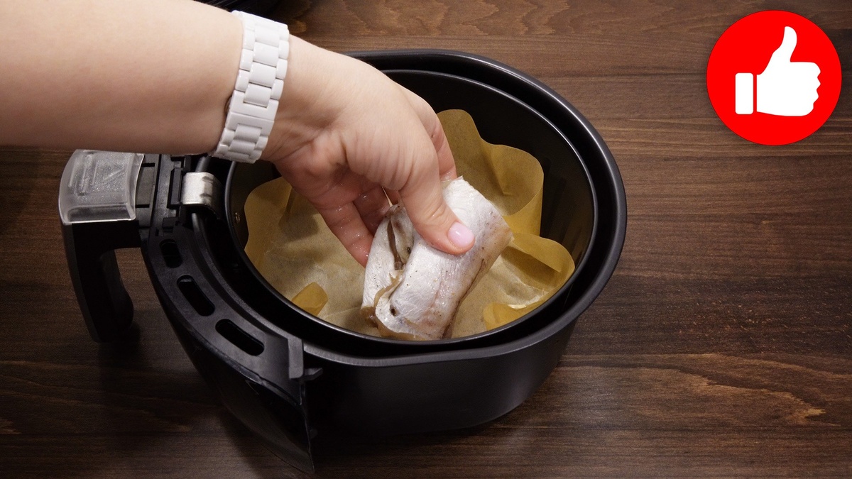 Для начала, следует очистить рыбу и нарезать её на крупные кусочки. Каждую порцию нужно хорошо посолить и поперчить, а затем обмазать растительным маслом. В корзину аэрогриля постелите бумагу для выпечки, на которую выложите подготовленные кусочки минтая.