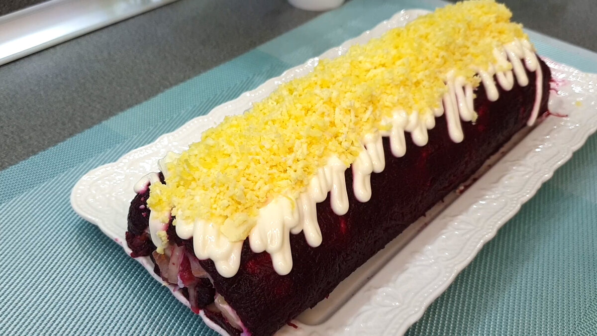 Через час аккуратно извлеките рулет с пленки, выложив на красивое блюдо. Нанесите майонез сверху и посыпьте натёртыми желтками. Ваш салат готов к подаче! Удивите родных и друзей оригинальной подачей привычного блюда, которое станет настоящим украшением любого стола.