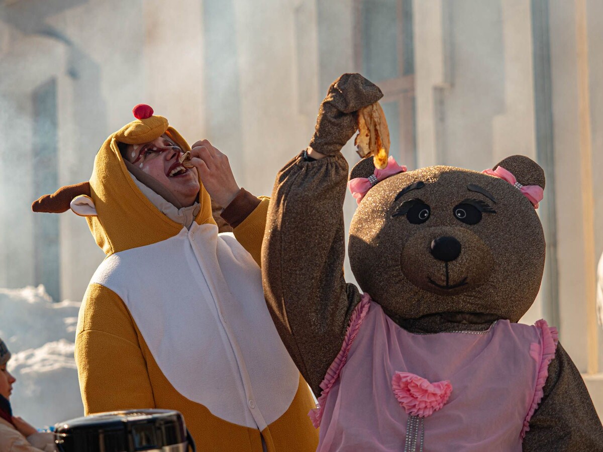 Масленица — это не только возможность насладиться вкусными угощениями, но и время горящих блинов, которые олицетворяют солнце. В этом году блины готовили с изюминкой: раскосые древесные колоды служили оригинальной плитой для их жарки, а кулинарные шедевры дополнили большой казан плова.
