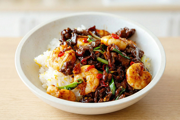 Говядину маринуют в соусе, воде и крахмале, что помогает ей оставаться сочной и правильно жариться. Креветки, в свою очередь, требуют всего полминуты на сковороде, лишь немного меняя цвет, чтобы не потерять свою упругость. Их быстро соединяют с говядиной в конце, добавляя зелень и чили.