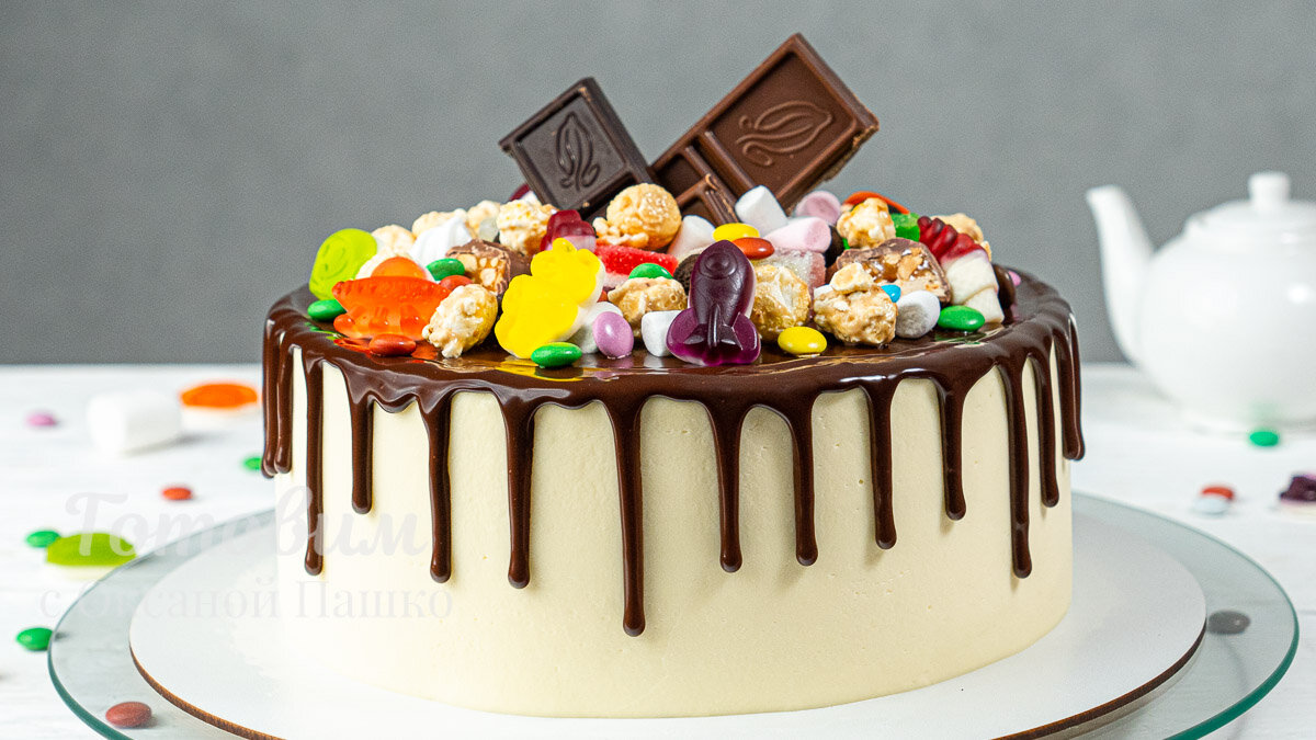 Этот невероятно красивый торт станет настоящим украшением любого праздника. Он порадует как детей, так и взрослых благодаря своему мягкому маковому бисквиту, который тает во рту. Нежный сливочно-творожный крем с добавлением лимонного курда придаст десерту яркую кислинку и свежесть. Обилие шоколада и разнообразных сладостей на поверхности торта добавляет праздничности и веселья, что точно не оставит равнодушными ваших гостей.