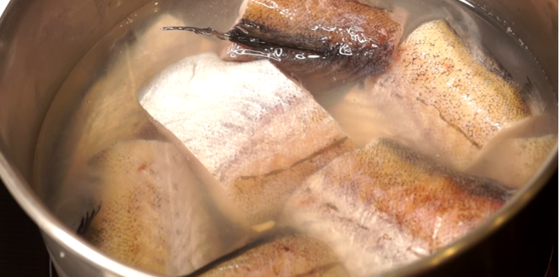 Сначала две порции рыбы разрезают на кусочки и помещают в кастрюлю, заливая огуречным рассолом, чтобы рыба была полностью покрыта.