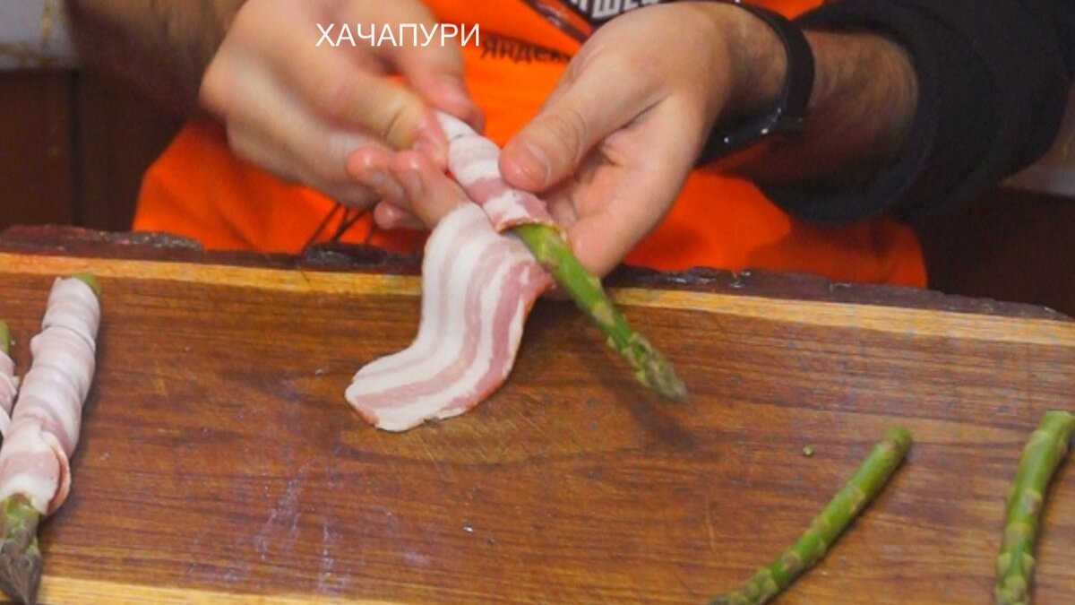 Итак, возьмите спаржу, фасоль или перец и заверните их в ленты бекона. Если бекон большой, разумно будет разрезать его на половинки для удобства.