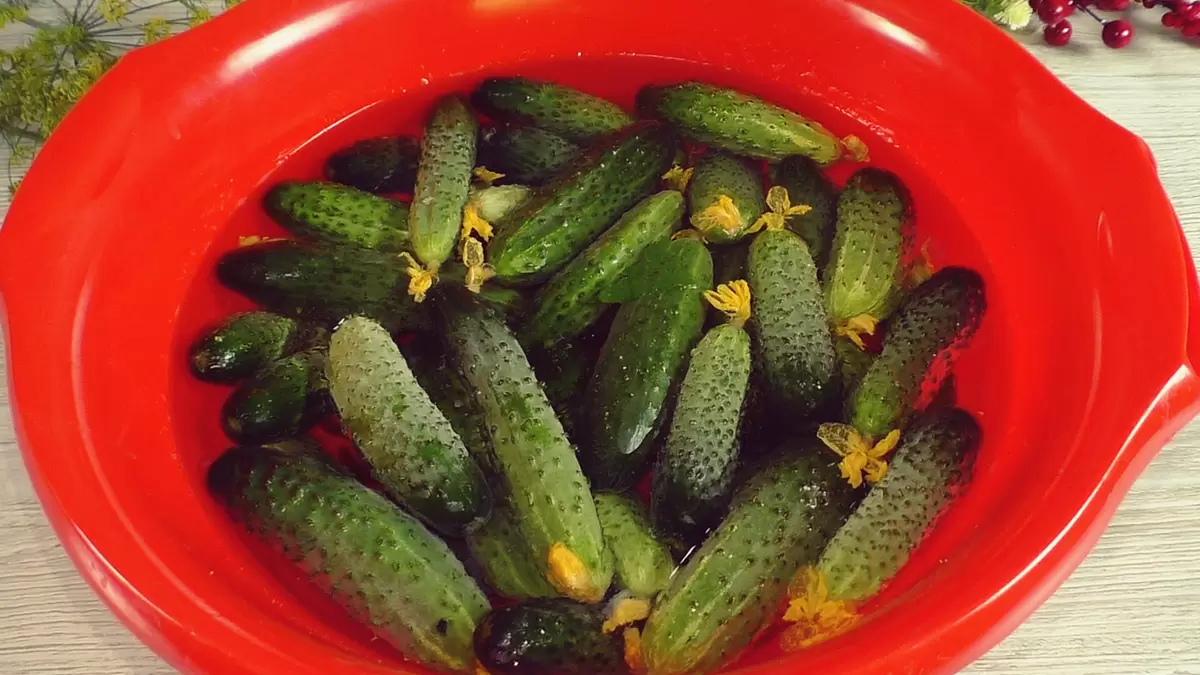 Свежие огурцы не требуется замачивать, если собраны только что с грядки. Достаточно промыть их прохладной водой в течение часа. После подготовки необходимо удалить ненужные части.