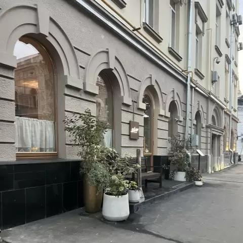 Необычная архитектура, сохранившая эстетику доходного дома начала XX века, приветствует посетителей в стеклянном предбаннике. Зал просторный с высокими окнами, через которые свет играет на шершавых стенах. Центральная часть ресторана занимает барная стойка, а также витрина с десертами и винный шкаф, что создает приятный контраст с основным дизайном. Звуки грузинской музыки, струящиеся из динамиков, сразу задают настроение. Хотя интерьер кажется современным, здесь есть элементы, которые придают месту уникальность и характер.