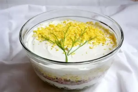 4. Теперь пришло время уложить белки. Нанести еще один слой майонеза, после чего слоями добавить натертое яблоко и сыр, аккуратно распределяя их. Завершает построение салата слой из желтков, который придаст ему дополнительный яркий оттенок.