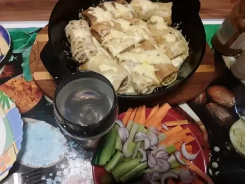 Фаршированные блины готовы, и наслаждаться ими можно с ягодными соусами, аджикой, домашним кетчупом или сметаной. Приятного аппетита!