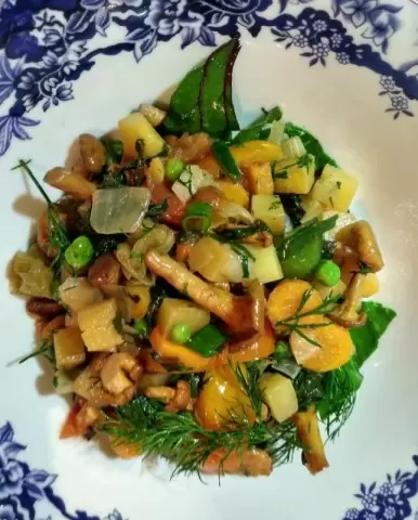 На растительном масле обжарить лук, морковь и перец до золотистого цвета. Кабачок и лисички обжаривать отдельно. После этого соединить обжаренные овощи с грибами, добавить немного воды или овощного бульона и готовить на медленном огне, пока овощи не достигнут желаемой консистенции: с хрустящей текстурой или полностью размягченные. В самом конце добавить дольки помидора, зелёный горошек, порубленный укроп, соль и специи, довести до вкуса и подождать еще 2 минуты для окончательного завершения приготовления.