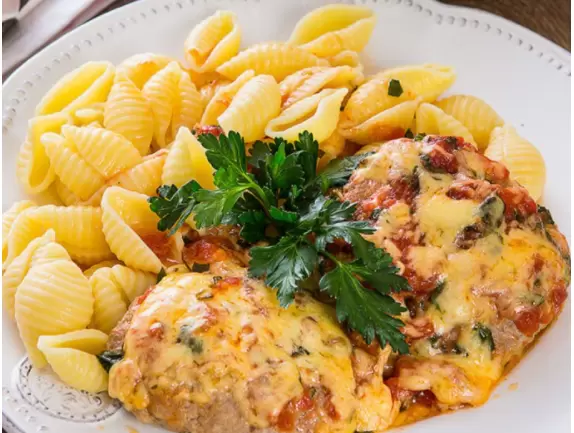 7. Подача блюда: Разложить запеченные котлеты на тарелки, рядом разместить макароны и украсить всё свежими веточками петрушки.