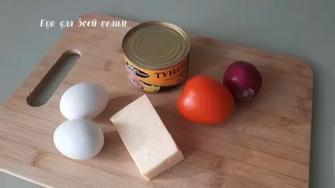 Для начала нужно слить жидкость из банки с тунцом и удалить крупные косточки. Разомните рыбу вилкой, выложите её первым слоем на плоское блюдо. Этот слой задаст основу салата и придаст ему насыщенный вкус.
