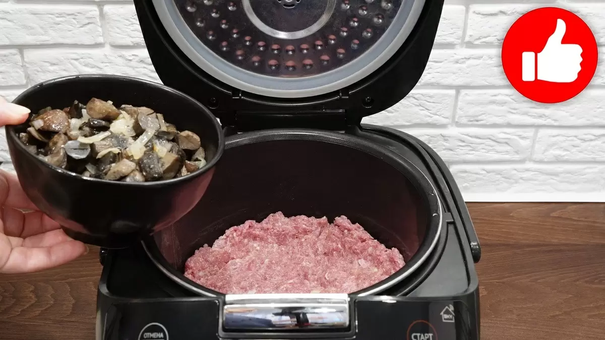 Сначала хорошо перемешайте яйцо, фарш, специи, измельченный чеснок, манную крупу и холодную воду. Для лучшей текстуры фарша его следует отбить 8 раз. Затем в чашу мультиварки налейте немного масла и выберите режим «Жарка». Обжаривайте нарезанный лук в течение 2 минут, затем добавьте грибы и продолжайте жарить еще 8 минут. После этого уберите лук с грибами и смажьте чашу мультиварки маслом.