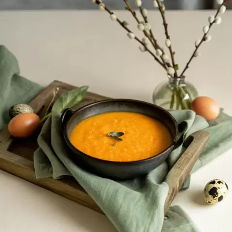 - Ингредиенты: Красная чечевица (100 г), морковь (150 г), лук (50 г), чеснок (2 зубчика), овощной бульон (500 мл), оливковое масло (10 мл), куркума (1 г) и зелень для украшения.