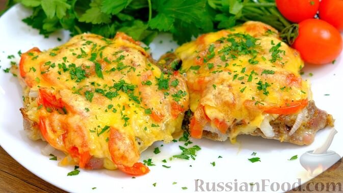 На завершение, запечённая свинина под сырно-овощной шубкой порадует всех любителей мяса. Нежное запечённое мясо с помидорами и сыром обязательно привлечёт внимание гостей.