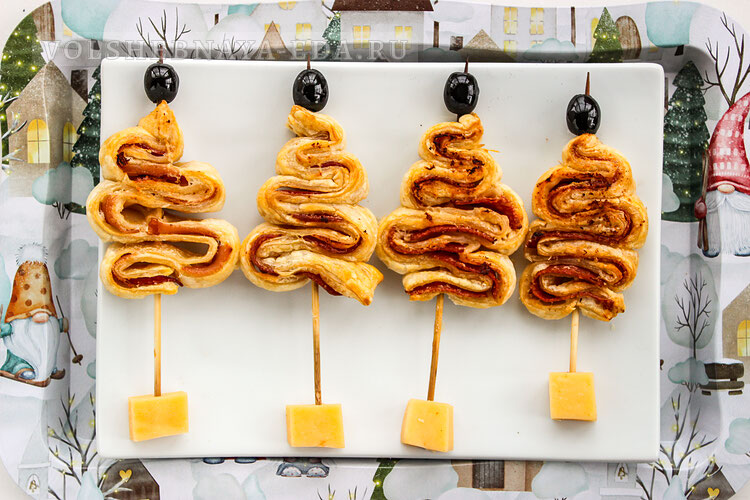 Ломтик слоеного теста становится основой для двух слоев начинки: сливочного сыра и тонко нарезанной колбасы или балыка. Тесто нарезают полосками, складывают в гармошку и закрепляют шпажкой — так формируется характерный силуэт елочки. Для завершения образа достаточно добавить украшения из оливки, маслины или сыра in виде звезды на верхушке.