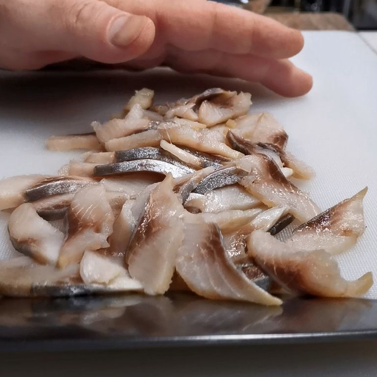 Основной компонент — селедка. Лучше всего использовать уже разделанное филе, чтобы избежать лишних хлопот. Нарезка должна быть средней по размеру, как на обычную закуску с луком, но не слишком крупной.