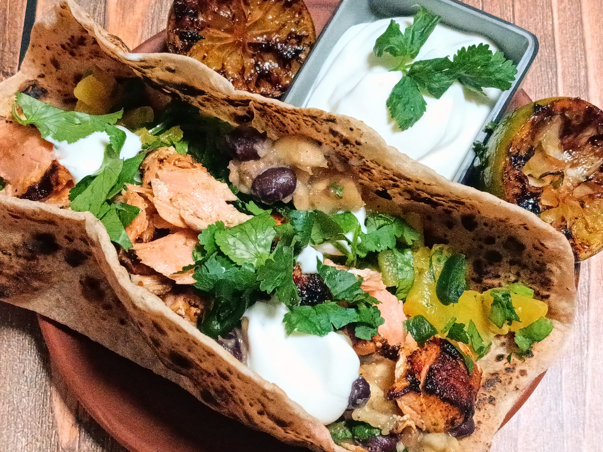 Приготовление незабываемого блюда - тако с ароматным гриль-лососем, приправленным пикантной ямайской смесью "jerk" и маринованным в свежем апельсиновом соке. На стороне - яркие карамелизированные ананасы, дополненные острым халапеньо и освежающим соком лайма, а также нежная сальса из бананов с черной фасолью и кинзой.