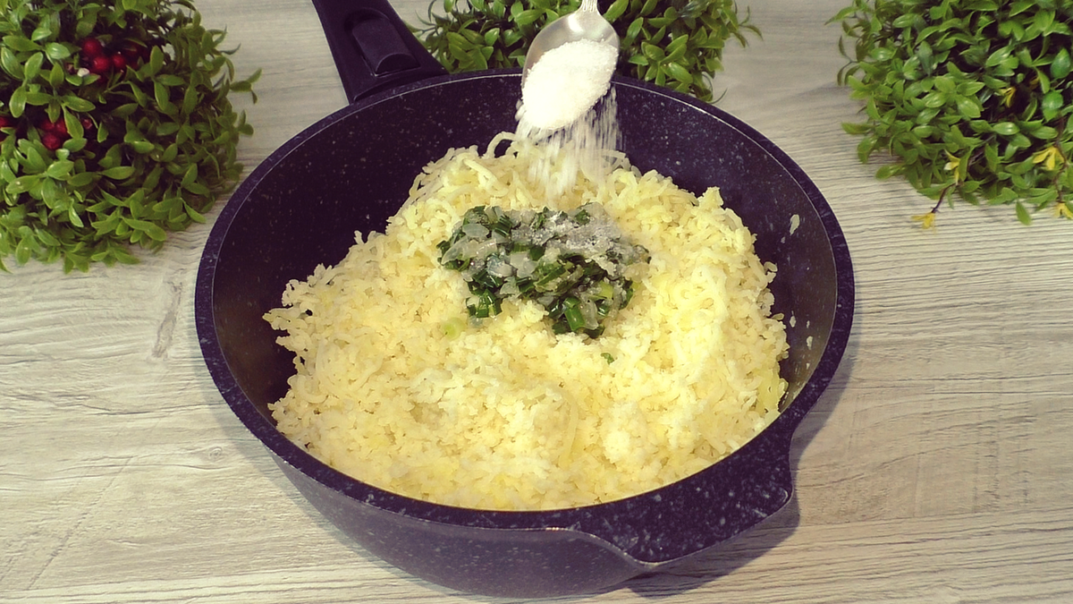 Приготовление заключается в том, чтобы сначала отварить картофель, затем его размять и обжарить лук до золотистого цвета. Все смешать, приправить и начинка готова.