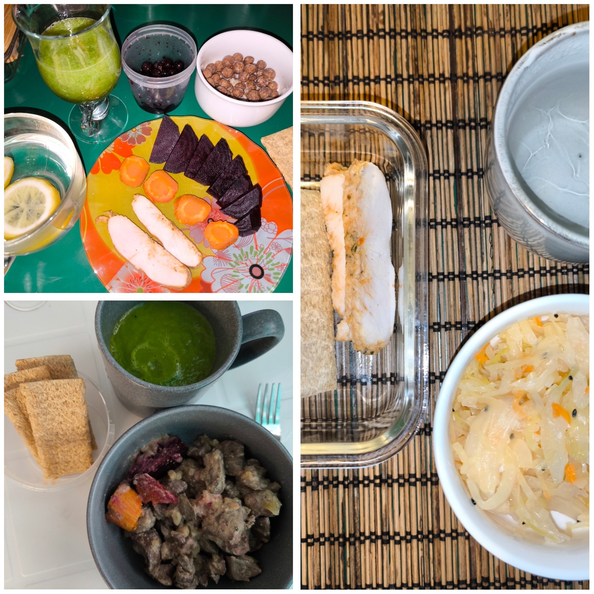 - Завтрак: запеченный свекольник, морковь и батат, куриная грудка, приготовленная методом су-вид, черная смородина, смузи из шпината и сельдерея, лимонная вода, рисовые хлебцы и протеиновый амарантовый десерт.