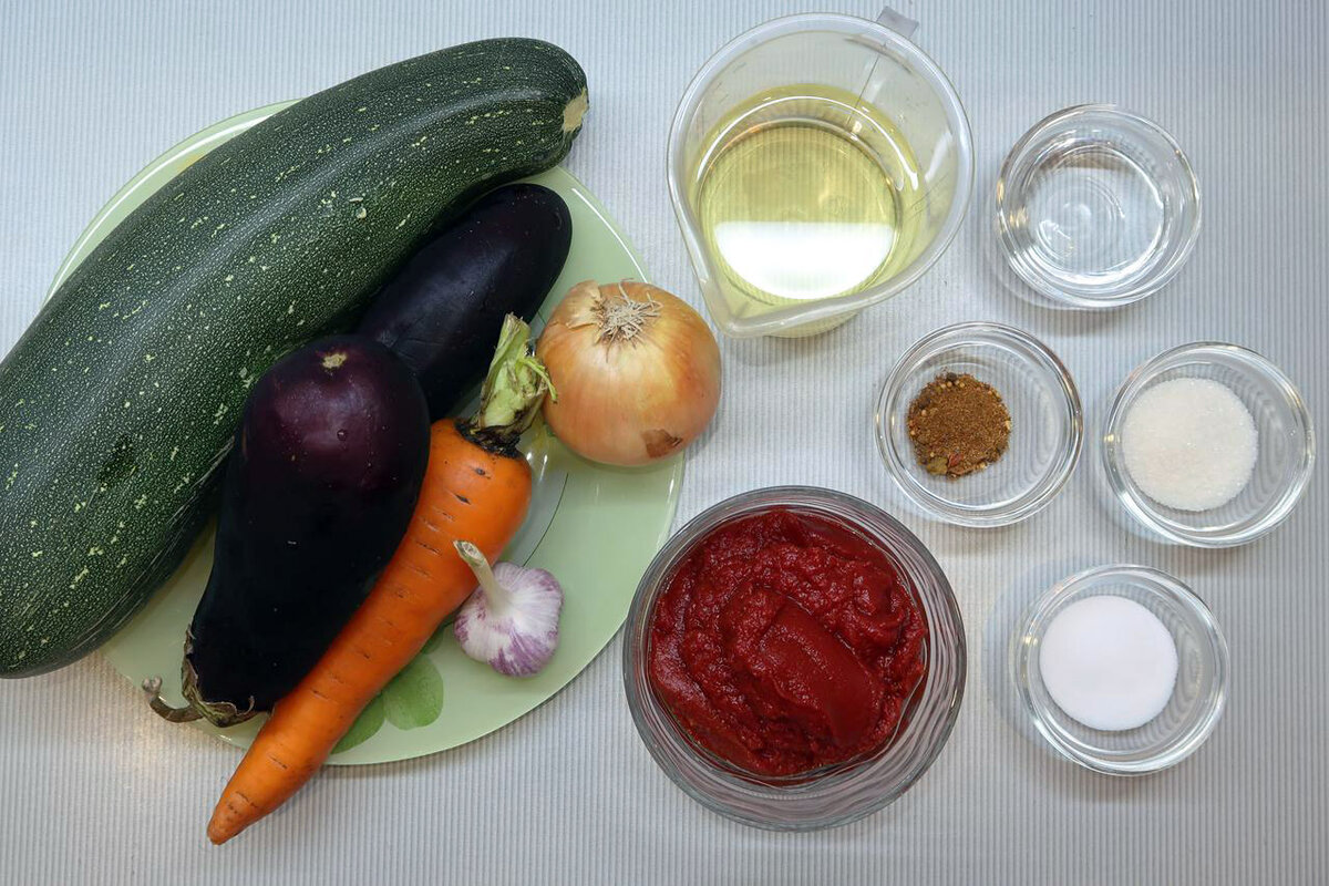Подготовка овощей: Начать следует с тщательной подготовки ингредиентов. Кабачки и баклажаны необходимо промыть, очистить от кожуры и нарезать небольшими кусочками. Морковь также следует очистить и нарезать. Лук очищается от шелухи и нарезается крупно, а чеснок натирается на терке.