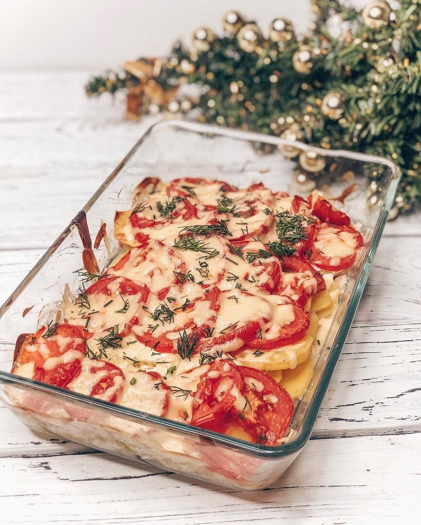 Далее укладываются два слоя тонких кружочков картофеля, которые также следует посолить и приправить. Затем следует слой помидоров, нарезанных кружками. Этот слой тоже стоит посолить и поперчить для лучшего вкуса.