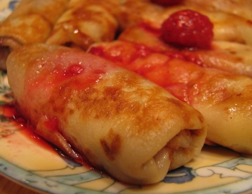 Эти компоненты нужно соединить и тщательно перемешать так, чтобы масса имела консистенцию сливок. После этого тесто следует накрыть и оставить в теплом месте на 2-3 часа. По истечении времени добавить 2-3 столовые ложки растительного масла и пожарить тонкие блинчики на сухой сковороде.