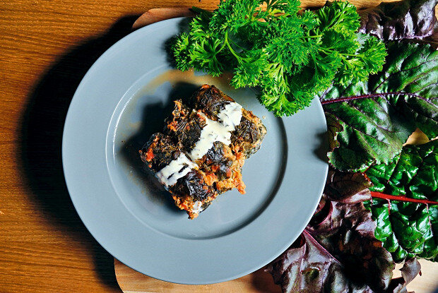 Сначала все мясо пропускают через мясорубку, чтобы получить фарш.Рис варят до полуготовности, затем смешивают с мясным фаршем. Лук мелко нарезают и обжаривают на масле, после чего добавляют к фаршу. Специи: соль и перец — по вкусу.Листья мангольда опускают в кипящую воду на 1 минуту и отбрасывают на дуршлаг для остывания.Для соуса помидоры без кожицы натирают на крупной терке или нарезают. Их объединяют со сметаной, добавляют соль и перец.Из готового фарша формируют голубцы: на каждый лист мангольда выкладывается 80 грамм фарша, после чего его заворачивают. В итоге получится от тридцати до тридцати пяти голубцов.Готовые голубцы укладываются на противень, заливаются сметанным соусом, посыпаются прованскими травами и рубленым чесноком.Запекают их в духовке при температуре 170 градусов около 30 минут.Перед подачей дополнительно полив сметаной, блюдо готово!