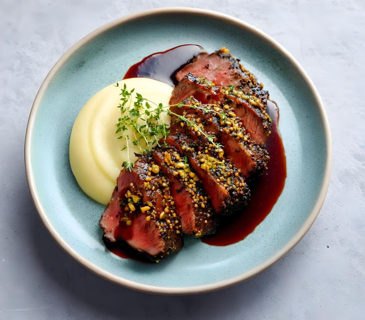 Греться у плиты — это не просто рутина, а возможность творить кулинарные шедевры! Сегодня внимание привлекает изысканное блюдо: говядина в перечно-горчичной корочке, которая идеально гармонирует с нежным картофельным пюре и соусом на основе красного вина.