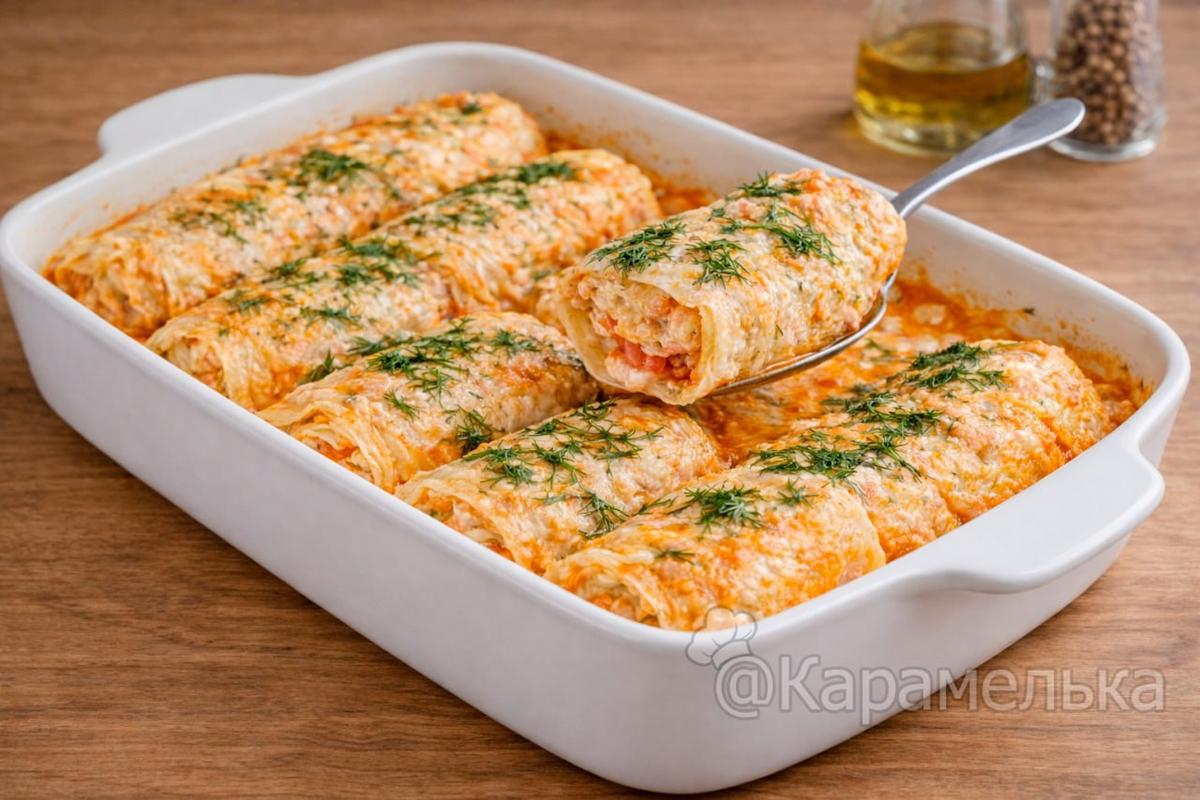 Эти голубцы получаются нежными, сочными, а щедрый томатно-сметанный соус добавляет невероятный вкус, проникая в каждый кусочек. В этом варианте есть особый шарм: начинка слегка подрумянивается, а края капусты остаются аппетитно открытыми.