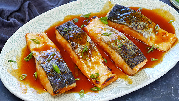 - Переложите лосось на тарелки, полейте соусом и украсьте мелко нарезанным зеленым луком. Подайте с подходящими гарнирами, такими как Бок-чой или грибы.
