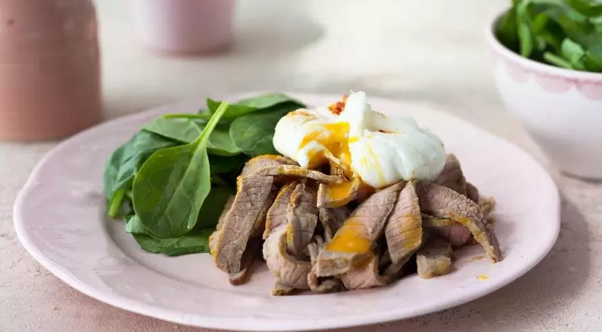 Для сервировки нарежьте стейк тонкими кусочками и выложите на тарелку. Рядом разместите шпинат, а сверху положите яйца-пашот. С помощью ножниц надрежьте пленку над яйцом и удалите ее. Приправьте блюдо копченой паприкой и подавайте к столу горячим.