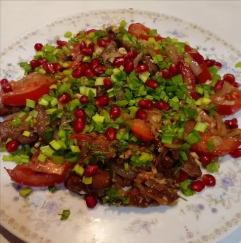 Перед подачей посыпать свежей зеленью и гранатовыми зёрнами. Салат прекрасно подходит как в теплом, так и в охлаждённом виде. Это блюдо будет радовать не только вкусом, но и ярким видом.