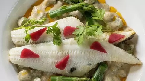 На отдельной сковороде обжарить филе ледяной рыбы на сливочном масле по полторы минуты с каждой стороны до готовности. Далее смешать нарезанную спаржу с баклажановым соусом и выложить на тарелку. Сверху красиво разместить обжаренную рыбу, украсить маринованным чесноком и свежей зеленью, сбрызнуть томатным маслом. Приятного аппетита!