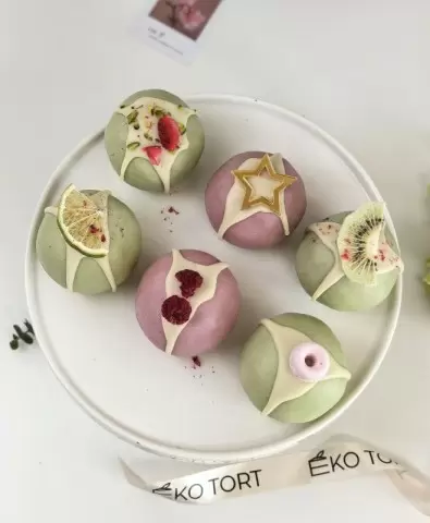 Каждый из этих десертов - это возможность проявить кулинарную фантазию, изменяя акценты и создавая новые комбинации. Например, сочетание манго - белый шоколад - кокос с хрустящей капсулой из белого шоколада и ярким манговым наполнителем подарит вам кусочек тропиков. КБЖУ на 100 г - 279/7/19/22 (без глазури), с глазурью - 340/7/25/26.