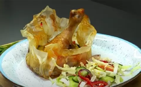 Запекайте куриные ножки в духовке при 180 градусах в течение 40 минут, не открывая упаковку, чтобы сохранить нежность курицы и ароматы овощей.