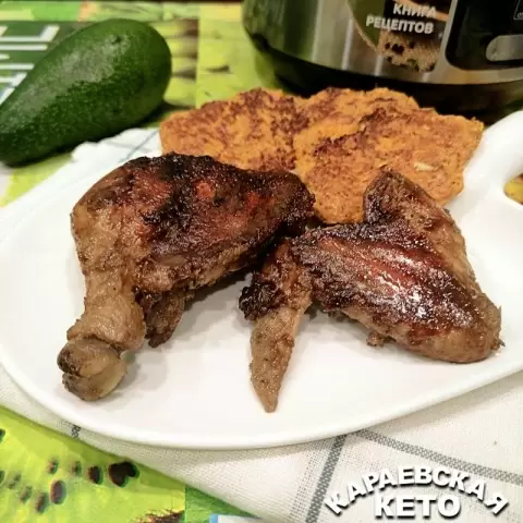 Для маринада и блюда потребуется небольшой набор: курица весом около 1,5 кг, оливковое масло, домашний майонез, горчица без сахара, соевый соус без сахара, чеснок, соль и перечень любимых приправ. Куски промариновать, оставить на час, затем готовить в мультиварке при режиме Мультиповар 130 градусов примерно 1 час 15 минут, с переворотом половины времени.