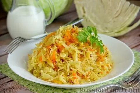 - Капуста в кефире: Полезное и диетическое блюдо. Тушеная в кефире белокочанная капуста приобретает мягкость и нежную кислинку. Добавление куркумы и тмина делает ее яркой и ароматной.