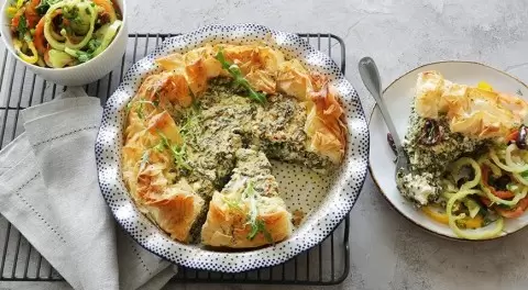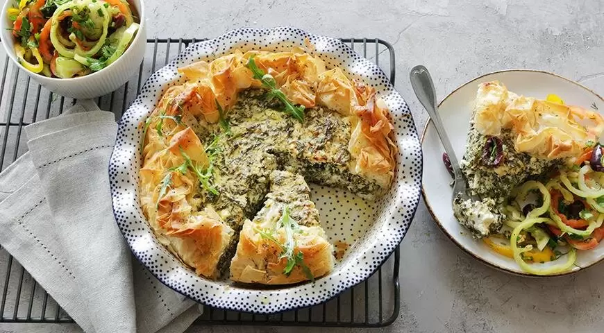 Этот великолепный пирог станет настоящим украшением вашего стола. Для его подачи рекомендуется приготовить свежий салат из сезонного перца с оливками, мятой и оливковым маслом, что придаст блюду яркие нотки.