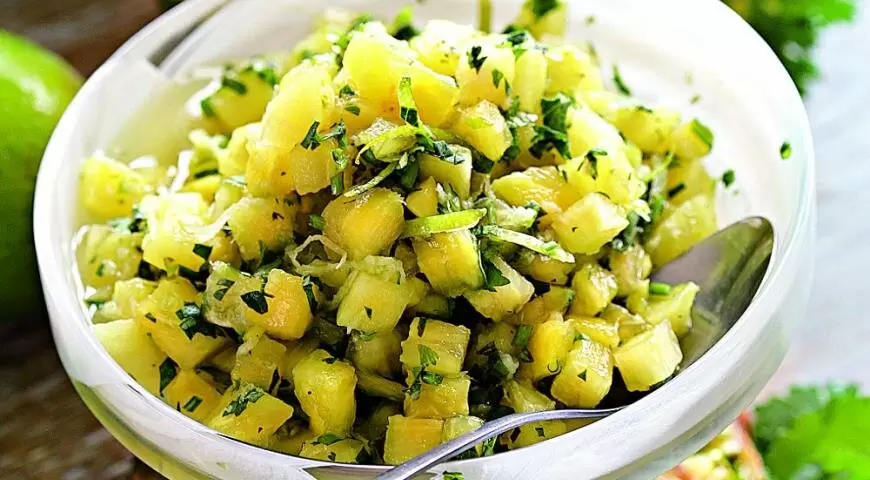 Смешайте в сотейнике уксус, сахар, сок лайма, измельченные стебли кинзы, имбирь и ананасовое пюре. Доведите до кипения и готовьте в течение трех минут, затем снимите с огня. Добавьте в смесь цедру, ананасовые кубики, соль и перец. Остудите, и после полного остывания, через час добавьте измельченные листья кинзы.