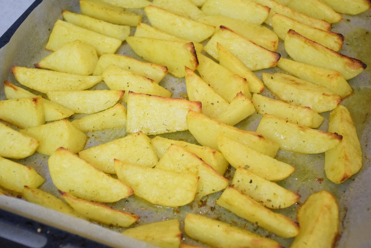 На противень или форму для выпекания укладываются картофельные дольки, которые следует разместить так, чтобы они не соприкасались. Сверху на них рекомендуется добавить небольшие кубики сливочного масла. Далее ставим все в разогретую духовку при температуре 190-200 градусов на 40-45 минут. Время запекания может варьироваться в зависимости от сорта картофеля — некоторые сорта могут приготовиться быстрее.