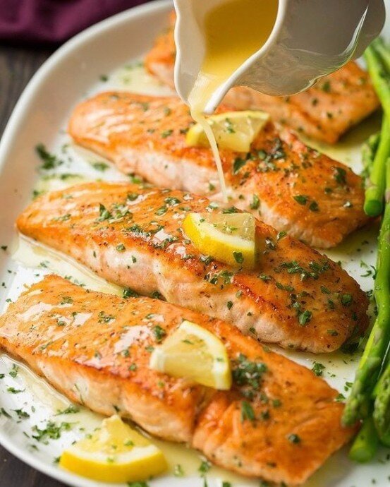 Положите рыбу на сервировочную тарелку, полейте лимонно-сливочным соусом, посыпьте свежей петрушкой и украсьте ломтиками лимона.
