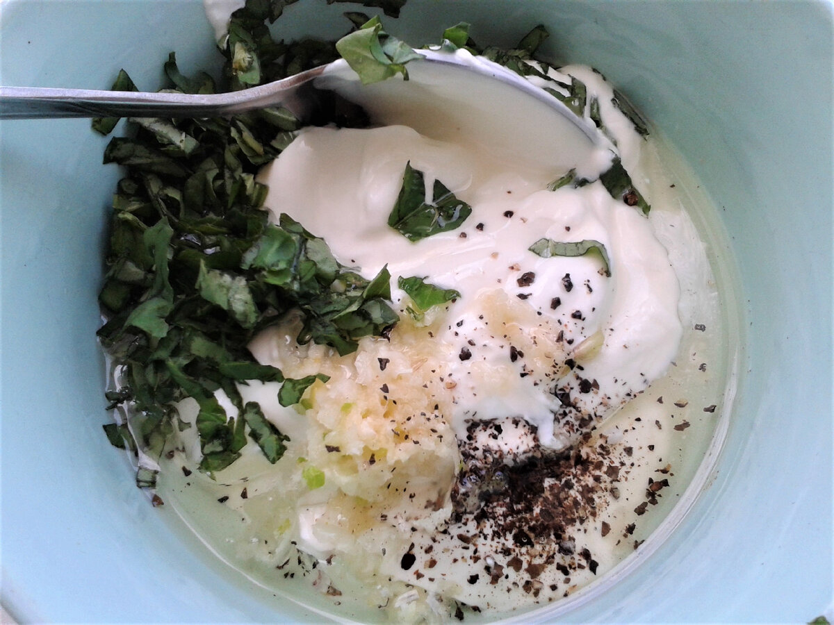 Пока тесто поднимается, пора заняться белым соусом. В миске нужно смешать греческий йогурт или сметану с мелко нарезанной зеленью (например, свежим базиликом), чесноком, солью и черным перцем, а также добавить немного лимонного сока и растительного масла. Все тщательно перемешиваем — соус готов!